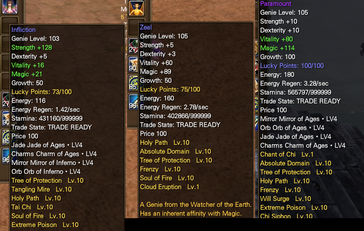 The main genie you’ll want for solo & squad play is either a Zeal or a Discipline, as they are MAG/VIT based. Whichever you pick doesn’t really matter that much, as you’ll not be using their innate skill, and the stat distribution will be equal regardless of choice, so you can pick whichever you prefer the look of. Zeal has exactly 1 extra chi generation after reaching level 105 so it’s technically better but you’ll never notice it in real gameplay.