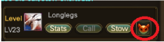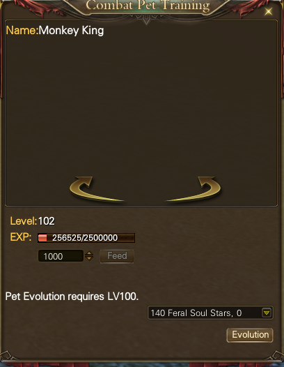 This will bring out a menu which allows you to feed the pet Feral Stars in order to level them up. Once the pet reaches a high enough level, if it’s a pet that has evolving capabilities, you will be able to Stow them, then Evolve them from the same window, using the button on the rightside of the window that pops up.