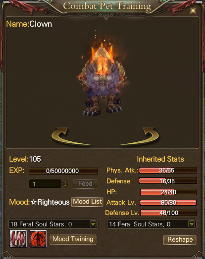 Once you’ve evolved your pet, you will see a new option pop up in the window where you evolved the pet and/or leveled them up. This will allow you to modify the pet’s mood using Feral Soul Stars. The mood dictates which mood-specific skills the pet will have. If you click the “mood list” button, you’ll see a list of all the moods the pet has available, all of which are random which ones you roll. The moods also have different levels, higher levels making the skills of that specific mood stronger.